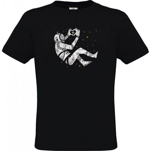 Ανδρικό T-Shirt Μαύρο 100% Βαμβακερό με Στάμπα .Αστροναύτης χέρια καρδια πλανήτης,Πλένεται στουs 30°C-40°C και Σιδερώνεται από την ανάποδη